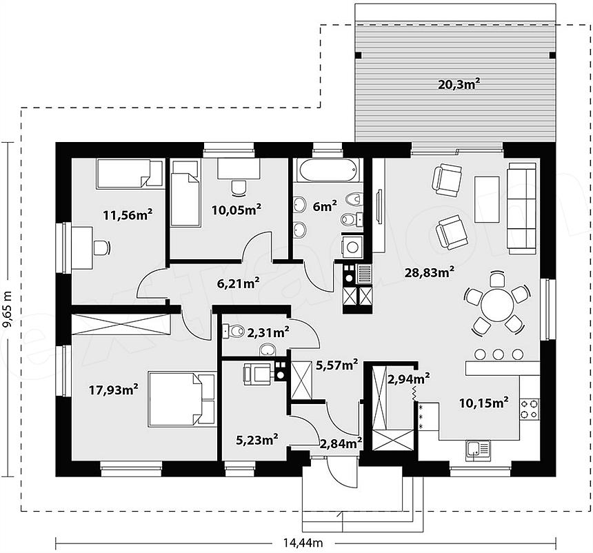 Dom jednorodzinny, parterowy, niepodpiwniczony. Wygodny, funkcjonalny, z optymalnie rozplanowaną przestrzenią. Przestronny salon połączony z kuchnią otwiera się na duży, zadaszony taras. Posiada spiżarnię dostępną z kuchni oraz kotłownię z możliwością zastosowania kotła na paliwo stałe. Dom jest tani i prosty w budowie a przez zastosowanie rozwiązań energooszczędnych również niedrogi w utrzymaniu. Projekt dostępny również w technologii szkieletu drewnianego.