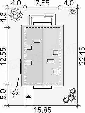 Niewielki dom przeznaczony na wąską działkę z wejściem od strony południowej. W piwnicy zaprojektowano kotłownię na paliwo stałe, skład opału oraz pralnię. Dodatkowym atutem jest wejście do piwnicy z wiatrołapu, co przy kotłowni na opał stały jest świetnym rozwiązaniem. Na parterze zaprojektowano kuchnię z jadalnią, salon i łazienkę. Na poddaszu znajdują się trzy sypialnie i łazienka.