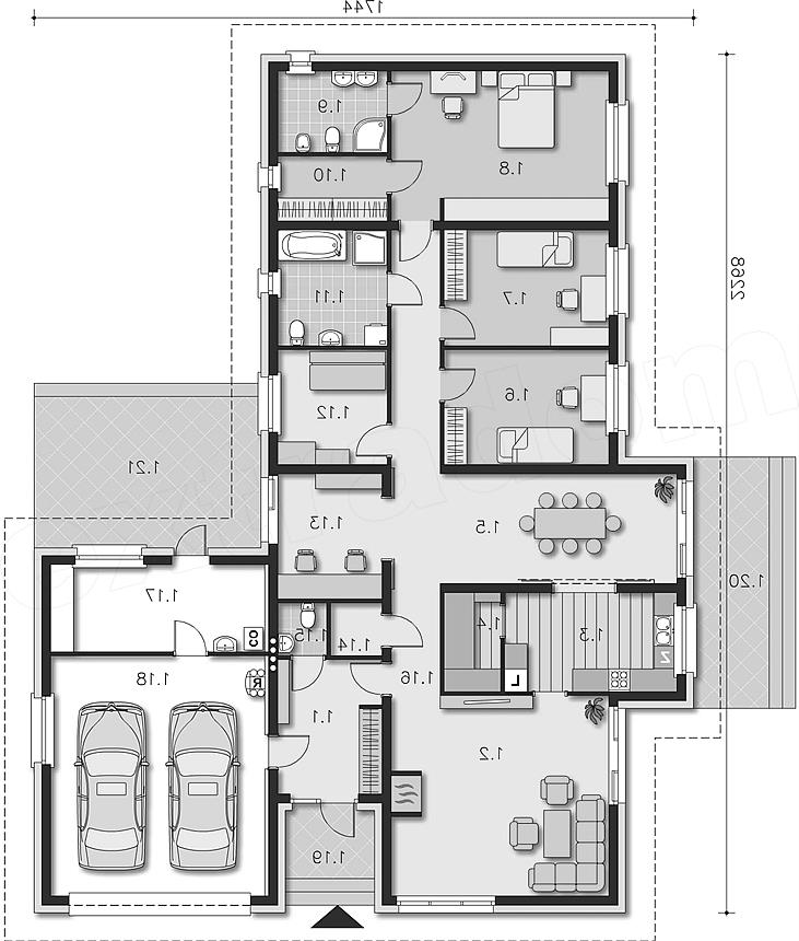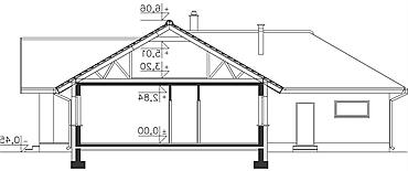 Energooszczędny dom, który, mimo że jest parterowy imponuje przestrzenią dzięki wysokim oknom w salonie i jadalni. Wersja w której powiększony został garaż oraz jadalnia i kuchnia. Projekt idealny na działki z wjazdem od południa. Mamy tutaj cztery sypialnie, z których jedna ma własną garderobę i łazienkę. Dodatkowo jest również gabinet, duża kotłownia, pomieszczenie gospodarcze i spiżarnia.