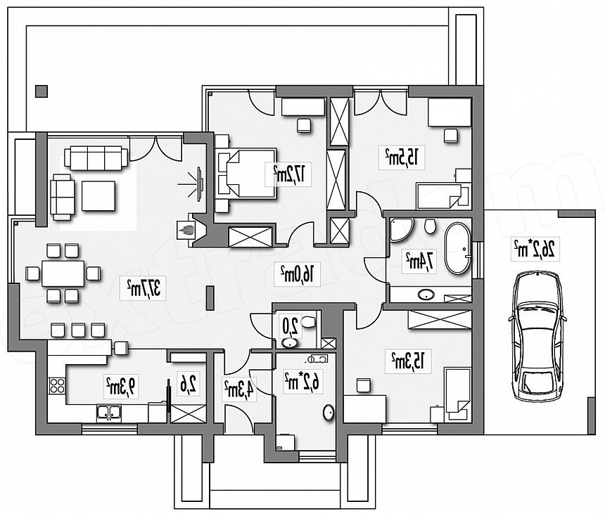 Wygodny , nieduży , ekonomiczny dom dla 4-6 osobowej rodziny. Wersja parterowa domu to przestronna część dzienna z zadaszonym tarasem i trzy sypialnie. Wyjście z sypialni do ogrodu wraz z ciekawie zaaranżowaną jadalnią dają możliwość kontaktu z naturą przez cały rok. W wersji podstawowej dom posiada zadaszoną wiatę (Alabama A). Możliwa jest również wersja bez wiaty (Alabama B) oraz z garażem jednostanowiskowym (Alabama C) i dwustanowiskowym (Alabama D). Dostępna również wersja większa z poddaszem i antresolą gdzie zmieszczą się dwie dodatkowe sypialnie i łazienka (Alabama 4) oraz wersje z inną aranżacją części z łazienką, sypialnią i kotłownią (Alabama - parterowa i Alabama 2 - z poddaszem). Dom dostępny w lustrzanym odbiciu oraz z kotłownią na paliwo stałe.
