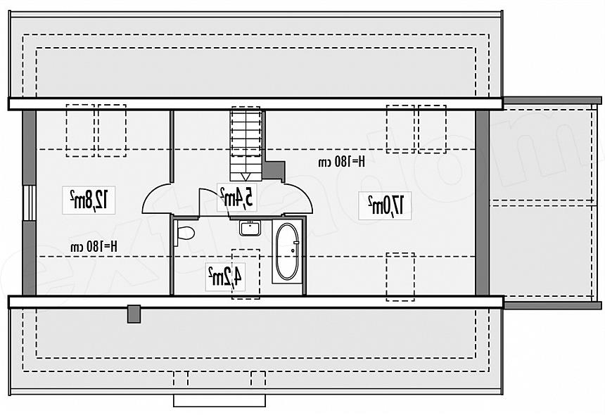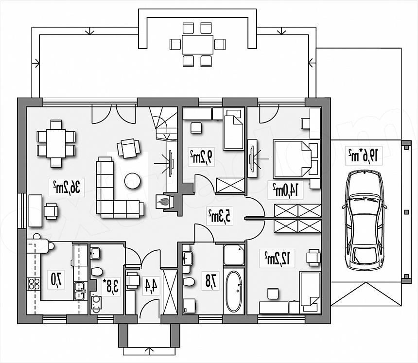Albert - przytulny parterowy dom dla 3-4 osobowej rodziny. Albert 2 -wersja z poddaszem użytkowym (kąt nachylenia dachu 33°), posiada dodatkowe dwa pokoje i łazienkę i jest przeznaczona dla 3-6 mieszkańców. Prosta, dwuspadowa konstrukcja dachu i stropu oraz optymalne wykorzystanie przestrzeni ewentualnego poddasza wpływa na optymalizację kosztu uzyskania powierzchni użytkowej w budynku. Duże przeszklenia drzwi tarasowych z części dziennej i sypialni, mocno integrują dom z ogrodem i jednocześnie zwiększają przestronność wnętrza. Projekt Abert i Albert 2 występują w wariantach: bez wykusza w jadalni (A), z wykuszem (B), a każdy z nich może mieć wiatę na auto lub nie. Dokumentacja techniczna tej wersji jest już gotowa.