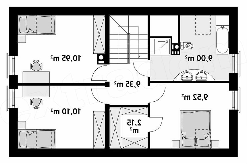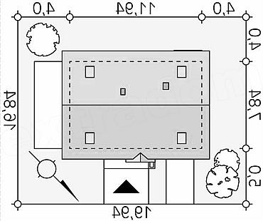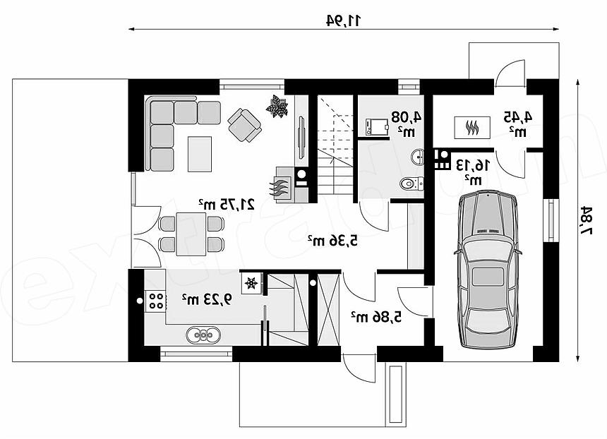 Zwarty energooszczędny dom o prostej bryle. Na poddaszu zaprojektowano przestronne trzy sypialnie z dużą łazienką i pomieszczeniem gospodarczym. Na parterze funkcjonalnie rozplanowano pomieszczenia dzienne i pomieszczenia pomocnicze. Dobrym rozwiązaniem jest połączenie domu z garażem poprzez śluzę, jaką jest wiatrołap. W kuchni znajduje się spiżarnia.