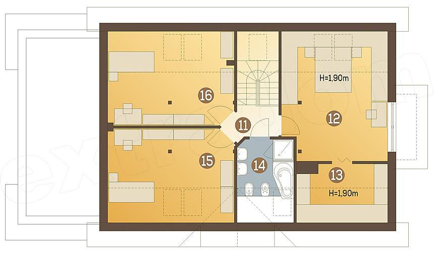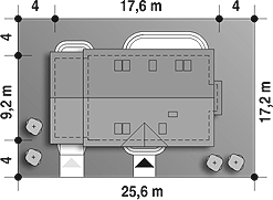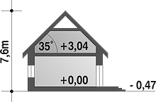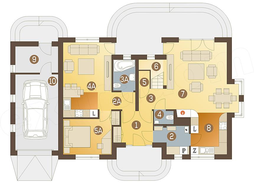 Amelia V to wersja projektu Amelia ale z dachem dwuspadowym. Przy tej samej powierzchni zabudowy oraz wysokości budynku uzyskano obszerniejsze pokoje na poddaszu a co za tym idzie większą powierzchnię użytkową. Amelia V to dom dwupokoleniowy, wolnostojący, niepodpiwniczony. Na stosunkowo niewielkiej powierzchni zaprojektowano 2 wygodne mieszkania: większe dla 4 osób, oraz mniejsze dla 1-2 osób. Mieszkanie mniejsze znajduje się na parterze, natomiast większe zajmuje część parteru oraz całe poddasze. Wejście główne oraz oba wyjścia tarasowe usytuowane są w wygodnych podcieniach, chroniących przed opadami. Wspólny taras łączy oba pokoje dzienne; w większym znalazł miejsce kominek. Pomieszczenie gospodarcze z pralką dostępne jest z wiatrołapu co umożliwia korzystanie z niego wszystkich domowników. Garaż oraz funkcjonalne pom. pomocnicze z wyjściem na ogród, doprojektowano z boku budynku.