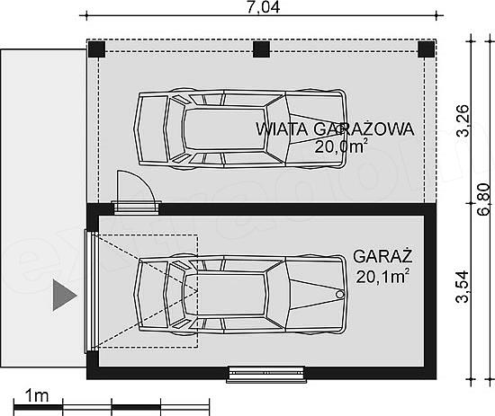 Garaż jednostanowiskowy wolnostojący z dodatkową wiatą garażową obok. Istnieje opcja tego projektu jako budynek gospodarczy.