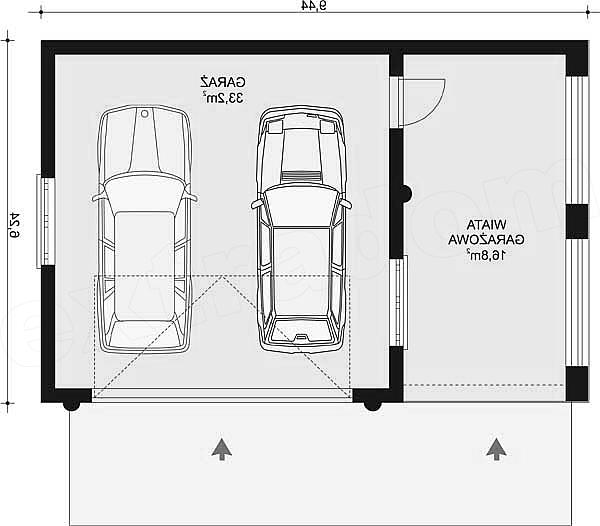 Garaż dwustanowiskowy jednoprzestrzenny wolnostojący z wiatą garażową obok. Istnieje opcja tego projektu jako budynek gospodarczy.