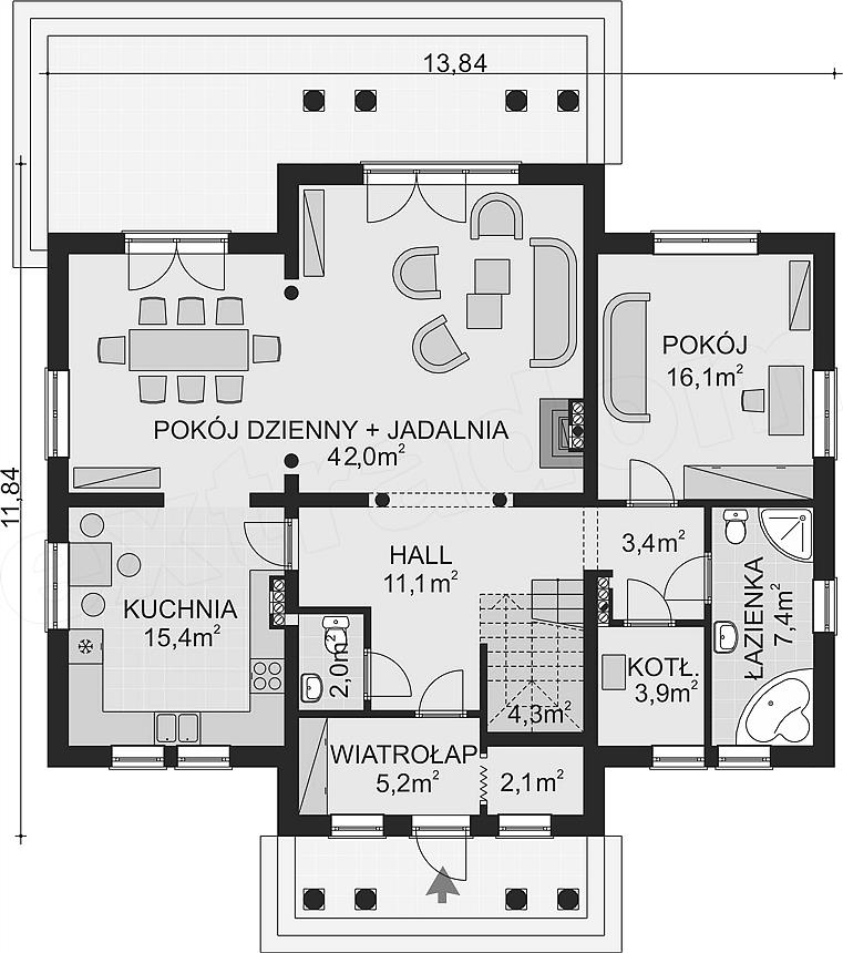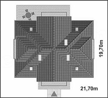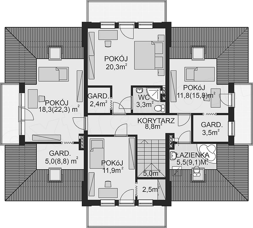 Okazały, reprezentacyjny dom o klasycznej urodzie i wygodnym układzie pomieszczeń dla 5-7 osobowej rodziny. Wejście do domu podkreślone balkonem z kolumnami, prowadzi przez wiatrołap do centralnego hallu. Od frontu znajduje się duża kuchnia, sąsiadująca z równie okazałą jadalnią. Jadalnia tworzy jedno wnętrze z obszernym pokojem dziennym, którego przestronność podkreśla brak zdecydowanego oddzielenia od innych pomieszczeń. Wyjście na taras przez szerokie przeszklone drzwi, ułatwia korzystanie z ogrodu w ciepłych porach roku. Obok - drugi mniejszy pokój gościnny lub gabinet z oddzielną łazienką, może być przewidziany dla starszego pokolenia w rodzinie wielopokoleniowej. Równie obszerne poddasze mieści cztery wygodne sypialnie, każda z garderobą i balkonem, oraz dwie łazienki. Dla osób przyzwyczajonych do tradycyjnego podziału pomieszczeń istnieje możliwość oddzielenia pokoi drzwiami.