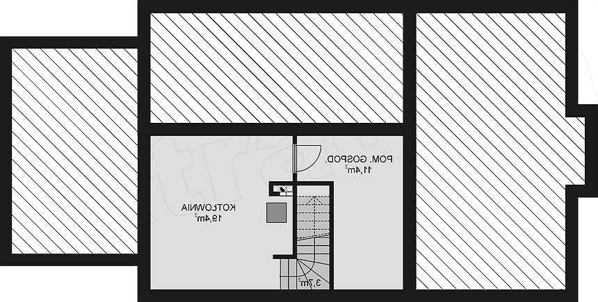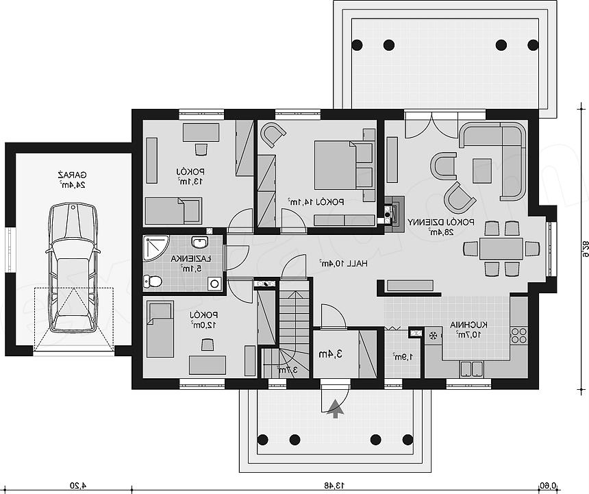 Wygodny, zgrabny, parterowy dom z klasycznym dworkowym frontonem wejściowym, opartym na zdwojonych kolumnach. Od frontu zlokalizowana jest zgrabna kuchnia z wydzieloną spiżarnią. W głębi domu znajduje sie duży salon, stanowiacy wizytówkę tego ładnego domu. Salon z kominkiem i wyjściem na duży zadaszony taras, z podcieniem nawiązującym do strony frontowej. W drugiej połowie domu znajduje się część sypialna. Strefy dzienna i sypialna są oddzielone, aby zapewnić prywatność mieszkańcom. Trzy wygodne sypialnie i zgrabna łazienka zapewnią komfort mieszkańcom. W piwnicy zlokalizowana jest kotłownia i część gospodarcza. Wielkość podpiwniczenia można dopasować do własnych potrzeb.