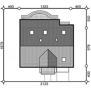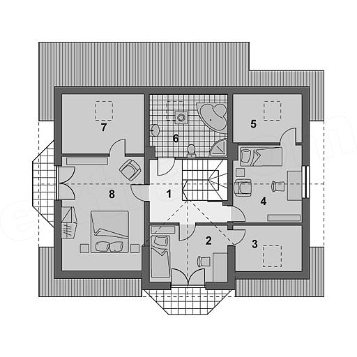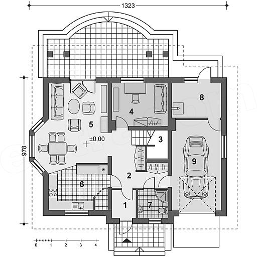 Zgrabny domek z poddaszem i wbudowanym garażem dla rodziny ceniącej wygodę i komfort. Kuchnia, usytuowana od frontu, sąsiaduje z pokojem dziennym posiadającym efektowny wykusz z jadalnią. Szeroki zadaszony taras może być przedłużeniem salonu, nawet przy niesprzyjającej pogodzie. Część sypialna posiada foremne pokoje praktycznie bez skosów – każdy z własną garderobą. Sypialnia małżeńska z balkonem.