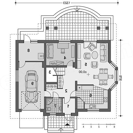 Zgrabny domek z poddaszem i wbudowanym garażem dla rodziny ceniącej wygodę i komfort. Kuchnia, usytuowana od frontu, sąsiaduje z pokojem dziennym posiadającym efektowny wykusz z jadalnią. Szeroki zadaszony taras może być przedłużeniem salonu, nawet przy niesprzyjającej pogodzie. Część sypialna posiada foremne pokoje praktycznie bez skosów – każdy z własną garderobą. Sypialnia małżeńska z balkonem.