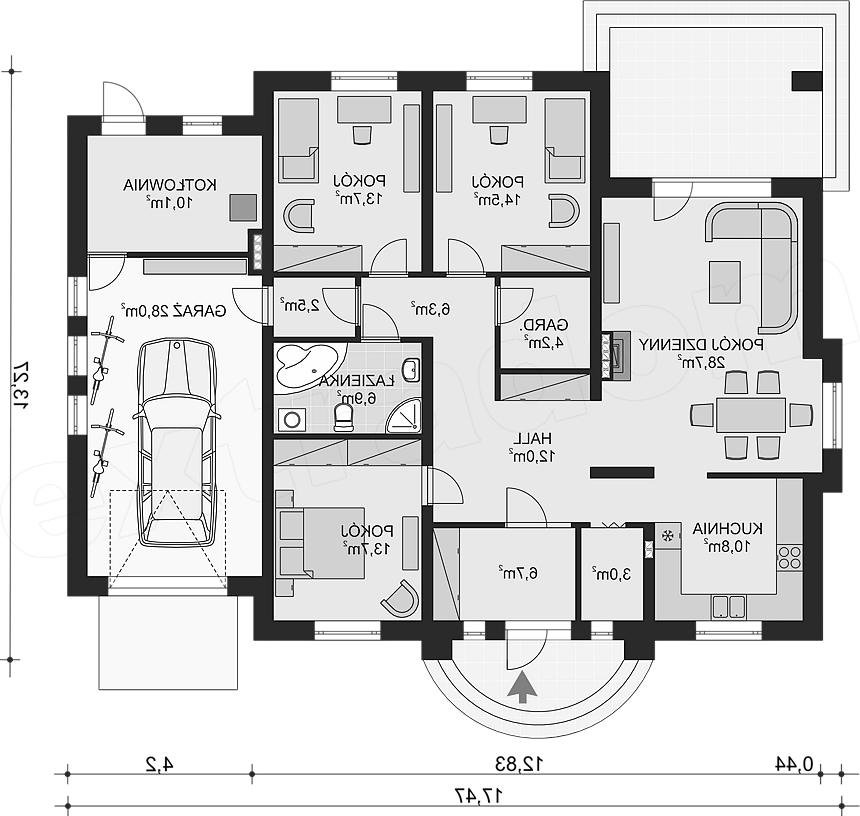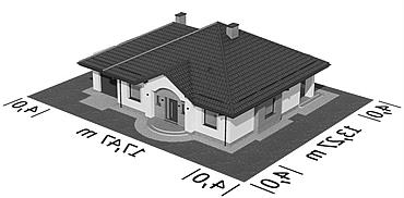 Obszerny parterowy dom dla 4-5 osobowej rodziny ceniącej wygodę mieszkania na jednym poziomie. Wejście do domu, pod łukowym podcieniem, prowadzi do sporego przedsionka z szafami ubraniowymi i dalej do obszernego hallu. Od strony frontowej zlokalizowana jest wygodna kuchnia ze spiżarnią. Przestronny salon z kominkiem i zadaszonym tarasem znajduje się w głębi domu. Pomiędzy kuchnią a salonem - jadalnia w wykuszu. Sypialnie dzieci znajdują się w głębi domu, co zapewnia im niezbędną izolację od wieczornego życia towarzyskiego rodziców. Sypialnia małżeńska - od strony frontowej. W miejscu centralnie umieszczonej garderoby można zlokalizować schody na strych, który można zamienić na poddasze z dodatkowymi sypialniami. Przejście do garażu i kotłowni - poprzez mały przedsionek. Obszerna kotłownia posiada miejsce na sprzęt ogrodowy lub turystyczny. Dostępna jest wersja projektu z garażem dwustanowiskowym.