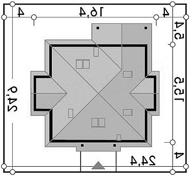 Pow. zabudowy 210 m2 Min. szer. działki 24,4 m Kąt nach. dachu 30 st