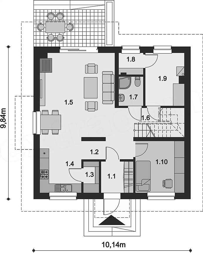 Projekt klasycznego domu z dwuspadowym dachem, w którym dużą uwagę poświęcono funkcjonalności pomieszczeń i wygodzie domowników. Zaletą parteru obok przestronnego salonu połączonego z otwartą kuchnią są: pojemna spiżarnia, dodatkowy pokój oraz duża kotłownia wraz z pomieszczeniem pomocniczym, która umożliwia zastosowanie różnego rodzaju sposobów ogrzewania. Na piętrze znalazły się trzy ustawne pokoje, jeden z własną garderobą, oraz duża łazienka z miejscem na wannę i prysznic. Dom doskonale nadaje się na wąską działkę. Dzięki nieskomplikowanej bryle jest on tani w budowie i późniejszej eksploatacji. Uwaga! Dokumentacja Projektowa nie zawiera elementów małej architektury takich jak: donice, podesty, altany, grille ogrodowe, murki, pergole, a także innych elementów wizualizacji, takich jak: garaże i wiaty wolnostojące, drogi, podjazdy, ogrodzenia, baseny itp.