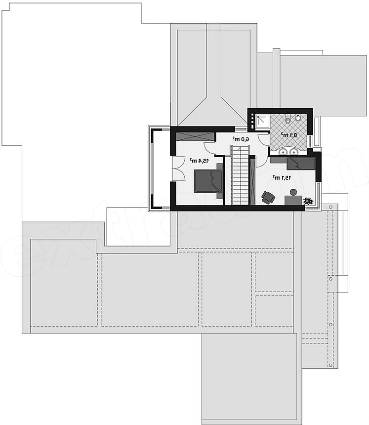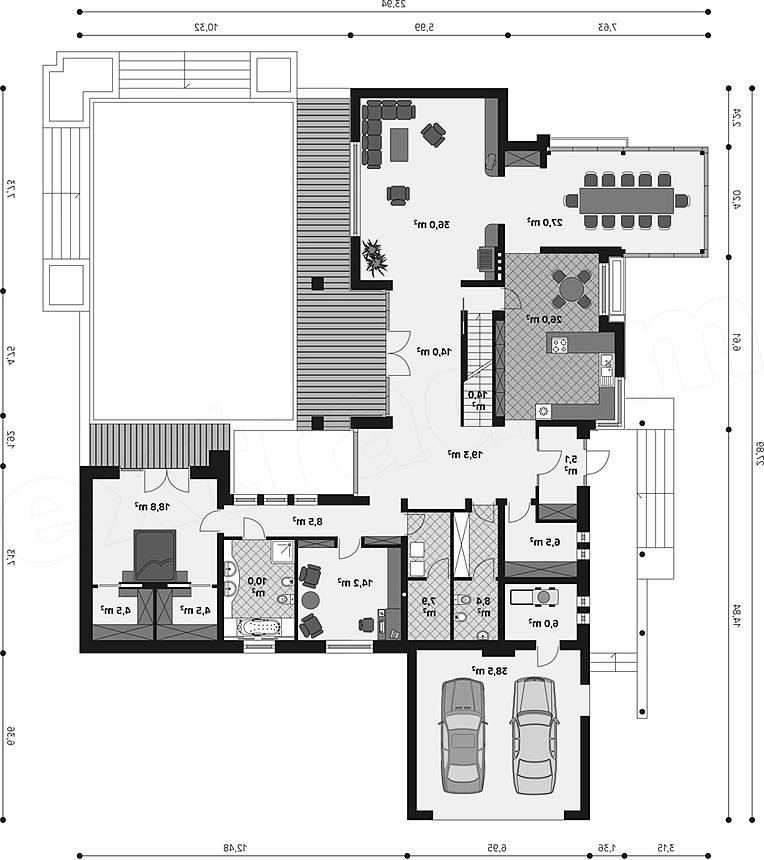 Arkadia to projekt nowoczesnego domu parterowego z garażem dwustanowiskowym, ewentualnym częściowym podpiwniczeniem oraz niewielką dodatkową kondygnacją. Budynek został zaprojektowany w stylu modernistycznym, który wyróżnia różnorodność materiałów wykończeniowych, duże przeszklenia oraz swobodnie kształtowana bryła budynku nieskrępowana dachem. Wnętrze domu posiada bardzo wyraźny podział na strefy dzienną, rekreacyjną, gospodarczą oraz nocną. Strefę dzienną tworzy przestronny salon połączony z dużą przeszkoloną jadalnią, w której znajduje się również przejście do kuchni. W kuchni poza dużą zabudową ścienną znajduje się długi blat roboczy oraz kącik śniadaniowy. Część dzienną z nocną łączy obszerny hol, w całości przeszklony od strony ogrodu. W części nocnej parteru zaprojektowano sypialnię gospodarzy z dwiema niezależnymi garderobami, gabinet, dwie łazienki, pralnię orz pomieszczenie gospodarcze. Atutem projektu jest rozległy taras biegnący wzdłuż tylnej elewacji budynku. Poddasze zostało zaprojektowane nad wydzieloną częścią parteru i składa się z dwóch mniejszych sypialni oraz łazienki. W budynku znajduje się także dwustanowiskowy garaż z wjazdem od strony elewacji bocznej, a nie frontowej jak to jest zazwyczaj. Garaż jest połączony z kotłownią dostosowaną pod ogrzewanie gazowe. Reprezentacyjny charakter budynku, sprawie, iż dom świetnie prezentuje się na dużych, podmiejskich działkach.
