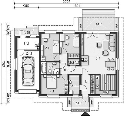 Niewielki, ale bardzo funkcjonalny dom parterowy, z wyraźnie wydzieloną częścią dzienną i nocną. W części dziennej znajduje się salon z kominkiem, kuchnia, którą, w zależności od potrzeb można zostawić otwartą na salon lub ją zamknąć, wc oraz pomieszczenie gospodarcze. Zaciszna część prywatna składa się z trzech sypialni i łazienki. Do domu przynależy jednostanowiskowy garaż, za którym znajduje się kotłownia, której usytuowanie i wymiary umożliwiają wstawienie pieca na paliwo stałe. Prosta bryła czyni dom tanim w budowie. Dostępna wersja projektu z kątem dachu 31°.