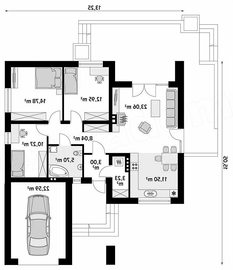 Atut 2 to niewielki dom parterowy zaprojektowany z myślą o komforcie 4-osobowej rodziny. 3Obszerny jednostanowiskowy garaż pomieści również dodatkowy jednoślad czy kosiarkę. Wnętrze, pomimo skromnej powierzchni , dzięki licznym przeszkleniom sprawia lekkie i przestronne wrażenie. Ciekawa bryła z wejściem zaakcentowanym podcieniem posiada wewnątrz klasyczny podział na część dzienną i nocną. Część dzienna to przestronny salon z kominkiem, otwarta kuchnia oraz jadalnia. Część nocna to trzy wygodne sypialnie oraz rodzinna łazienka.