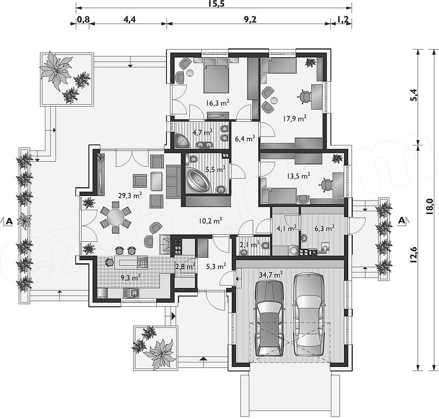 Jeśli dysponujemy dużą, płaską działką, to projekty parterowych domów z Rodziny Aurelii o rozbudowanych rzutach w pełni wykorzystają jej zalety. Rozłożyste sylwetki z wielospadowymi dachami doskonale wpiszą się w rozległy ogród. Projekt domu Aurelia Rex jest najmniejszy w rodzinie. Główne wejście osłania w nim, jak w pozostałych wariantach, dwustanowiskowy, wysunięty ku frontowi garaż, który wraz z pralnią i kotłownią tworzy gospodarczą strefę mieszkania. W głębi planu, otwarty hol oddziela część dzienną od przedpokoju części prywatnej, złożonej z trzech sypialni i dwóch łazienek. Efektowny pokój dzienny tworzy z kuchnią jedno wnętrze z centralnie położoną jadalnią, którą oświetla duże przeszklenie z wyjściem na taras. Zaakcentowano je zwróconym ku ogrodowi ryzalitem i przełamaniem prostej linii okapu. Tylko projekt parterowego domu zaoferować może tak komfortowe, niestandardowe rozwiązania, jakie pokazuje projekt domu Aurelia Rex w układzie głównej sypialni. Wyposażona we własną łazienkę i wyjście na, wspólny z salonem, taras. Wszystko to sprawia, że dom, mimo niewielkiej wielkości, ma charakter mini rezydencji.