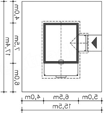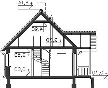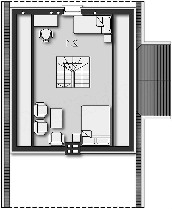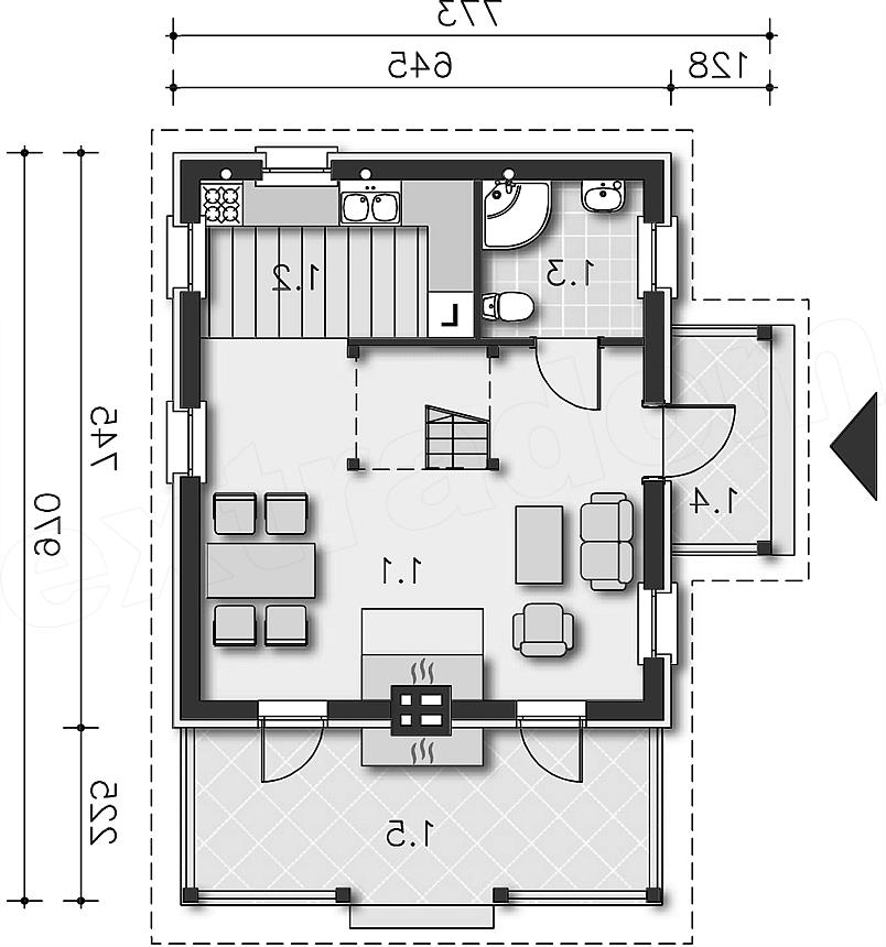 Romantyczny, niewielki domek letniskowy, prosty i tani w realizacji. Wejście do domu zaakcentowane jest poprzez zadaszony ganek. Na parterze jest pokój rekreacyjny z kominkiem i wyjściem na taras, aneks kuchenny i łazienka. Usytuowanie kominka pozwala na jego użytkowanie wewnątrz i na zewnątrz domu. Duży zadaszony taras przy pokoju rekreacyjnym, daje cień i osłania przed deszczem. Drewniane schody prowadzą na poddasze, gdzie znajduje się sypialnia.
