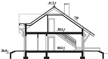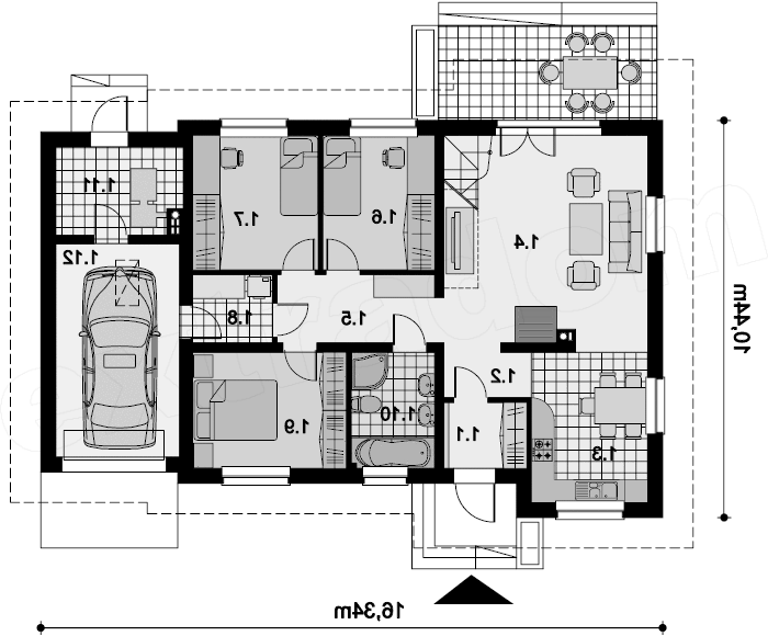 Projekt klasycznego domu parterowego z możliwością adaptacji poddasza. Parter budynku został podzielony na 3 strefy. Strefa dzienna to duża, jasna kuchnia oraz przestronny salon z centralnie umieszczonym kominkiem. Przewidziano w nim miejsce na schody, prowadzące na ewentualne poddasze. Strefa nocna to 3 ustawne pokoje oraz jasna łazienka, w której zmieści się wanna i prysznic. Do strefy gospodarczej należą: praktyczna pralnia, łącząca dom z garażem oraz duża kotłownia, w której zaprojektowano piec na paliwo stałe. Dzięki zastosowaniu stropu Teriva, przestrzeń na poddaszu można organizować w dowolny sposób. Nasza propozycja to 2 dodatkowe pokoje, 2 garderoby i wygodna łazienka, co daje dodatkowe 55 m² powierzchni użytkowej domu (liczone na 190 cm) . Dom można budować etapami, adaptacja poddasza może być przeprowadzona później. Dzięki zastosowaniu prostych rozwiązań dom jest tani w budowie i późniejszej eksploatacji. Uwaga! Dokumentacja Projektowa nie zawiera elementów małej architektury takich jak: donice, podesty, altany, grille ogrodowe, murki, pergole, a także innych elementów wizualizacji, takich jak: garaże i wiaty wolnostojące, drogi, podjazdy, ogrodzenia, baseny itp.