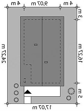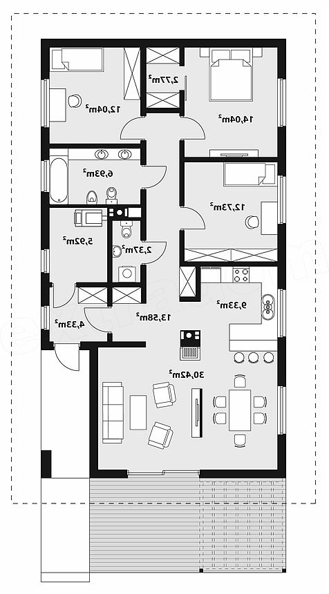 Parterowy dom jednorodzinny zaprojektowany na wąską działkę z wejściem od południa, zaprojektowany w technologii szkieletu drewnianego. W prostej bryle przykrytej dwuspadowym dachem zawiera się fukncjonalne i wygodne wnętrze. Od strony wejścia zaprojektowano dużą przestrzeń dzienną z otwartą kuchnią, jadalnią i salonem z przeszklonym wyjściem na taras. Dom ten zapewni wygodę 4-osobowej rodzinie oferując 3 wygodne sypialnie, łazienkę i wc. Sporo miejsca przewidziano też na szafy i schowki. Kotłownia umożliwia zastosowanie kotła na dowolny rodzaj paliwa a jej powierzchnię można dodatkowo powiększyć kosztem pomieszczeń sąsiednich przesuwając ściany działowe. Jest to prosty dom, tani w budowie i późniejszej eksploatacji. Projekt dostępny również w wersji murowanej