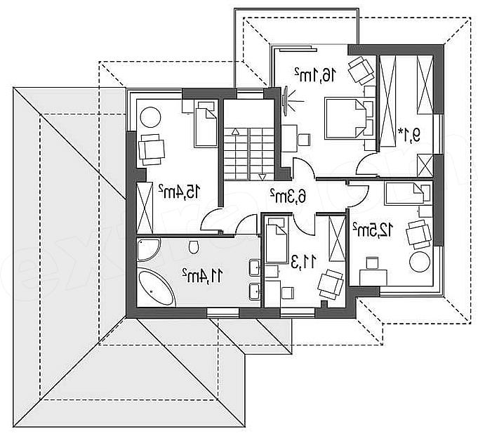 Boss to nowoczesny i komfortowy dom przeznaczony dla rodziny 4-5 osobowej. Do jego wnętrza wchodzi się przez reprezentacyjne drzwi z bocznymi naświetlami. Obszerny przedsionek prowadzi do strefy dziennej, która składa się z kuchni jadalni i części wypoczynkowej. Doświetlona dużym narożnym oknem jadalnia znajduje się tuż przy wygodnej kuchni, która dzięki temu może posiadać bardzo modną i praktyczną wyspę kuchenną. Jadalnia i kuchnia otwarte są na cześć wypoczynkową a wszystkie razem otaczają piękny trójstronny kominek - prawdziwe gorące serce domu. Na zorientowany od strony ogrodowej taras wychodzi się przez duże przeszklenie, balkonowego narożnego okna. Ono zapewnia mnóstwo ciepłego słonecznego światła, piękny widok na ogród i łączący dom z ogrodem taras. Na parterze znajduje się jeszcze jeden pokój mogący pełnić rolę sypialni lub gabinetu. Na piętro prowadzą wygodne schody doświetlone oknem. Tam znajdują się trzy sypialnie, dwie garderoby i łazienka. Przez panoramiczne, narożne okno balkonowe wychodzi się z głównej, obszernej , mającej własną garderobę sypialni, na duży balkon.Dostępna jest również wersja B projektu z czterema sypialniami na piętrze. Projekt został opracowany w wariancie z kotłem gazowym lub na paliwo stałe, również w lustrzanym odbiciu.