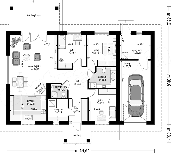 Projekt domu Bursztyn to propozycja budynku jednorodzinnego dla 4-5 osobowej rodziny. Projekt Bursztyn to dom o prostej bryle, przekryty dwuspadowym dachem. Ekonomiczny i nieskomplikowany w budowie. We wnętrzu domu przewidziano oprócz obszernego salonu trzy sypialnie, łazienki oraz pomieszczenie gospodarcze. W projekcie Bursztyn kocioł c.o. może znajdować się wariantowo w pomieszczeniu przy wejściu, lub w przypadku kotłowni na paliwo stałe - w pomieszczeniu za garażem. Pracownia posiada także projekt Bursztyn w odbiciu lustrzanym.
