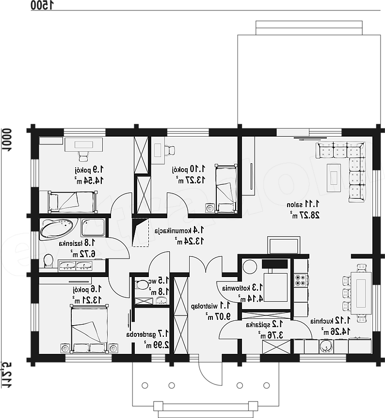 Parterowy dom o bardzo funkcjonalnym układzie pomieszczeń. Kominek w salonie z możliwością rozprowadzenia ciepła. Wydzielona kotłownia i spiżarka. Kuchnia częściowo otwarta na salon, trzy sypialnie w tym jedna z garderobą.