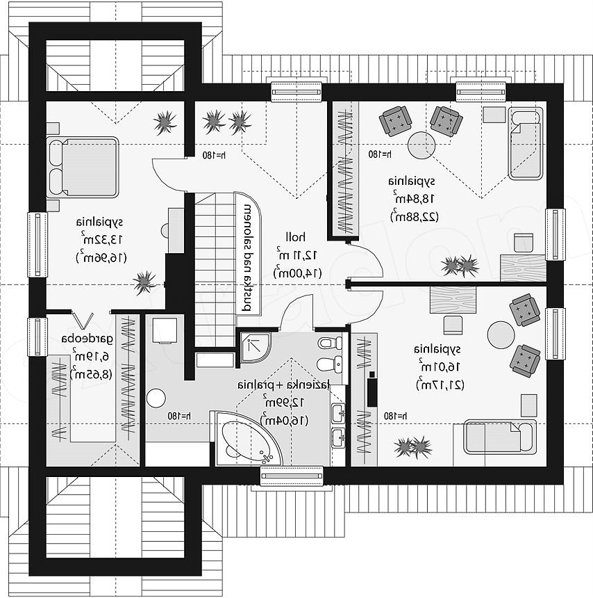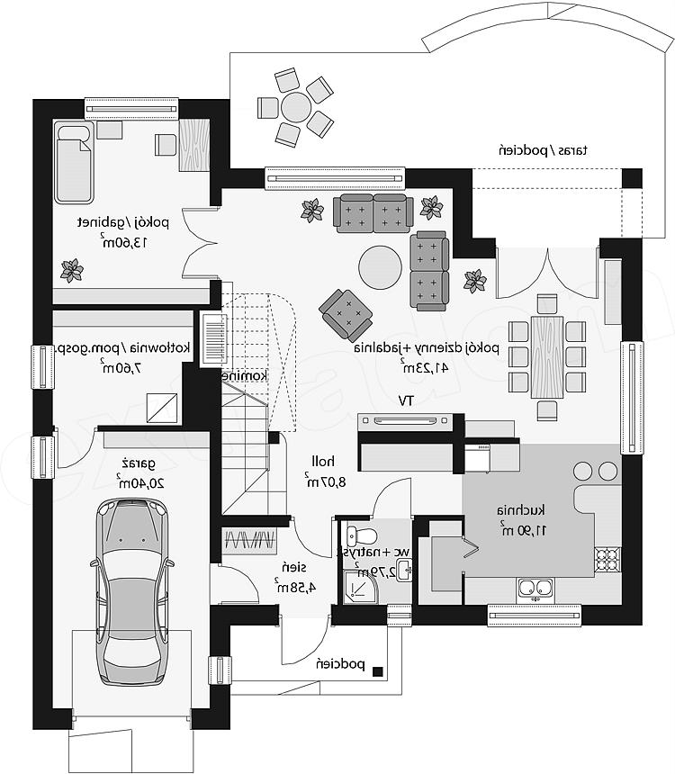 Projekt domu Cukiereczek to sympatyczny domek jednorodzinny dla rodziny cztero-sześcioosobowej. Cukiereczek to parterowy dom z poddaszem użytkowym, przekryty dwuspadowym dachem, częściowo wbudowanym w bryłę garażem. Architektura Cukiereczka stanowi połączenie skromnego, oszczędnego w detale wyglądu zewnętrznego, z jednoczesnym zachowaniem ludzkiej skali bryły. Projekt domu Cukiereczek charakteryzuyje się funkcjonalnym, logicznie zaplanowanym wnętrzem. Na parterze zaprojektowano obszerny salon z częściowo oddzieloną jadalnią, z której jest połączenie z półotwartą kuchnią i wyjście do podcienia ogrodowego i na taras. W salonie przewidziano miejsce na wbudowany w ścianę kominek. Z salonu widoczne są także częściowo schody, zaczynające swój bieg w holu - tuż przy wejściu. Na parterze zaplanowano też dodatkowy pokój - gabinet lub sypialnię gościnną, oraz część gospodarczą, z garażem i kotłownią. Na poddaszu zaprojektowano trzy duże sypialnie, w tym sypialnię rodziców z dużą garderobą, oraz bardzo ładną rodzinną łazienkę z kącikiem na pralnię i suszarnię. Pracownia posiada wersję odbicia lustrzanego projektu Cukiereczek.