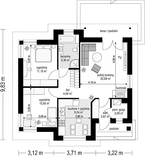 Projekt domu Cypisek to propozycja niewielkiego domku jednorodzinnego dla 3-4osobowej rodziny. Cypisek to dom o prostokątnej bryle, przekrytej dwuspadowym, symetrycznym dachem. Prostą bryłę ozdobiono ciekawymi detalami, jak zadaszony wykusz kuchenny, narożny podcień wejściowy z kolumienką, narożne okna sypialni, czy podcień ogrodowy nad tarasem. Dobrane ze smakiem, nowoczesne materiały i kolorystyka w połączeniu z tradycyjną bryłą dają niepowtarzalny efekt. Wnętrze domku to trzypokojowe, wygodne mieszkanie, z dodatkowym przedsionkiem wejściowym i kotłownią. Salon wzbogacono o narożny kominek widoczny z każdego miejsca części dziennej i szerokie przeszklone drzwi otwierające dom na taras i ogród. Nieużytkowy strych nad parterem można dość łatwo zaadaptować na dodatkowe poddasze. Pracownia posiada także projekt Cypisek w odbiciu lustrzanym.