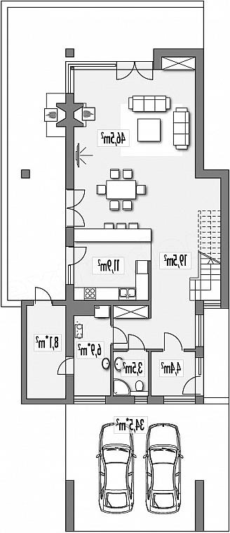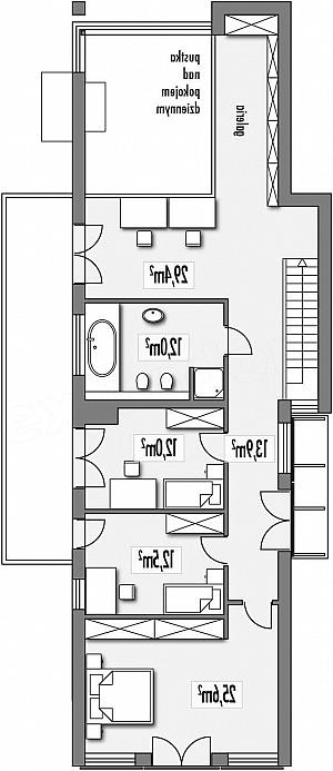 Wygodny, przestronny dom na wąską działkę (15,8m). Nowoczesny wygląd powoduje, że będzie pasował zarówno do otoczenia naturą, jak i do zabudowy miejskiej. Parter to strefa dzienna - duży salon z jadalnią , kuchnia, pom. gospodarcze. Wszystko otwarte na ogród. Dodatkowe pomieszczenie. na sprzęt ogrodniczy lub skład opału. Piętro to trzy sypialnie a także na ciekawie rozwiązanej galerii miejsce do pracy lub zabawy, domową biblioteczkę z widokiem na pokój dzienny poniżej. Pokoje na piętrze posiadają wyjście na balkon. Taras do dowolnej aranżacji (basen nie jest częścią składową projektu - to tylko propozycja zagospodarowania ogrodu). Możliwa też wersja B z zabudowaną wiatą - uzyskujemy wówczas garaż na dwa samochody.
