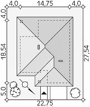 Pow. zabudowy 222,08 m2 Min. szer. działki 22,75 m Kąt nach. dachu 25 st
