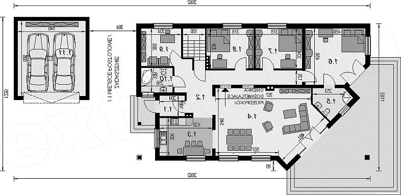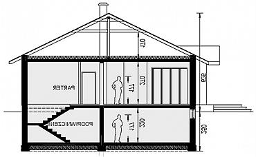 Dom parterowy został opracowany na nietypową działkę na zlecenie indywidualne. Cechą wyróżniającą ten dom spośród innych jest ścięty narożnik części domu od strony salonu, który powoduje że dom pasuje do nietypowej lokalizacji. Garaż 2 stanowiskowy można wykonać w 2 etapie inwestycji lub zrezygnować z niego. Wnętrze domu zostało podzielone na strefę dzienną i nocną. W strefie dziennej znajduje się duży salon o powierzchni ponad 43 m2. W strefie nocnej znajdują się 3 sypialnie w tym jedna 2-osobowa z własną łazienką.