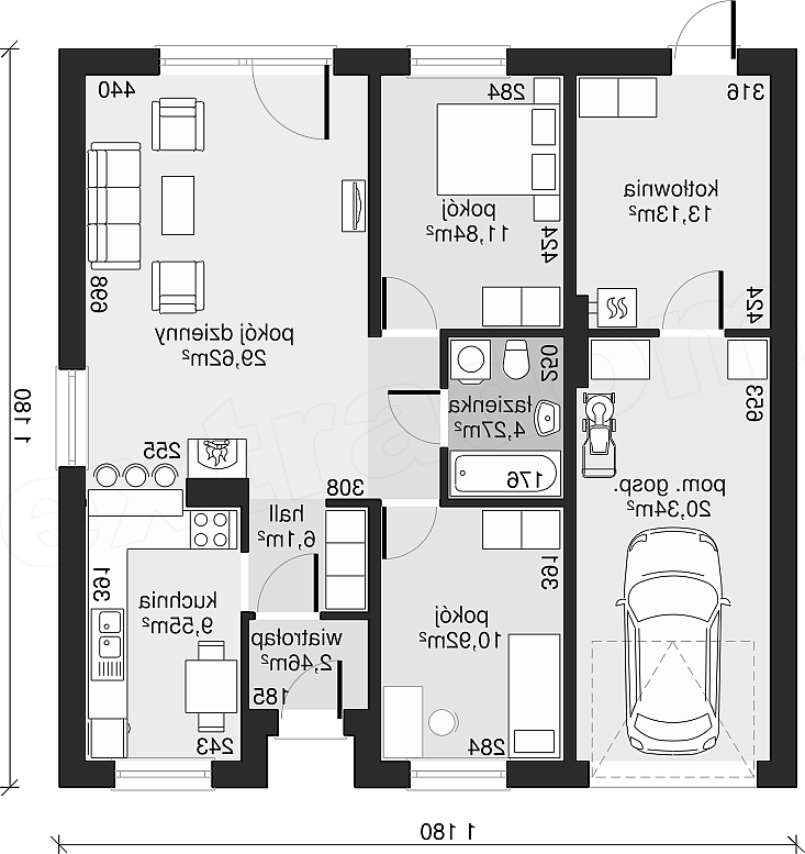 Komfortowy dom parterowy. Idealna propozycja dla osób praktycznych, poszukujących niewielkiego i ekonomicznego domu. Okładziny z drewna i kamienia na elewacjach nadają mu świeży, nowoczesny charakter i atrakcyjny wygląd. Wewnątrz zadbano o czytelny i funkcjonalny układ pomieszczeń. Program użytkowy obejmuje duży pokój dzienny z wyjściem na taras, otwartą kuchnię, dwie sypialnie i łazienkę. Dom posiada również garaż jednostanowiskowy i pomieszczenie gospodarcze z kotłownią.