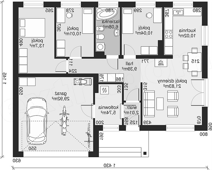 Nowoczesny dom parterowy z wbudowanym garażem dwustanowiskowym. Nieskomplikowana bryła, urozmaicona wejściowym podcieniem, oraz dwuspadowy dach gwarantują minimalne koszty budowy. Funkcjonalny rozkład wnętrza pozwala na maksymalne wykorzystanie dostępnej przestrzeni. Dom ten z pewnością przypadnie do gustu rodzinom ceniącym sobie wygodę i oszczędność. Nachylenie połaci dachu pod kątem 30o skłania do rozważań nad możliwością wykorzystania poddasza. Projekt dostępny również w wersji z dachem o kącie nachylenia 25°.