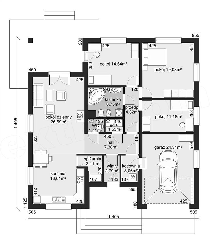 Nowoczesny, jasny i wygodny dom parterowy z garażem. Jego zaletą jest: nieskomplikowana bryła nakryta czterospadowym dachem, z wejściem i tarasem w podcieniu, oraz proste elewacje wykończone jasnym tynkiem i okładziną z naturalnego kamienia. Funkcjonalnie zaprojektowane wnętrze zapewnia komfort czteroosobowej rodzinie. Po lewej stronie kuchnia ze spiżarnią otwarta na salon z wyjściem do ogrodu tworzą część dzienną. Po prawej zlokalizowano część gospodarczą (kotłownia + garaż). Natomiast od strony ogrodu znajdują się trzy zaciszne sypialnie (oddziela je dodatkowo korytarz) ze wspólną łazienką.