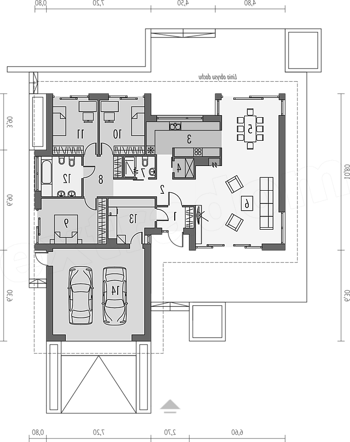 Dominik II G2 (wersja B) to dom wypełniony ciepłym urokiem i przytulną atmosferą. Ciekawa forma została ozdobiona modną kompozycją elewacji – surowy odcień tynku harmonijnie komponuje się z ognistą czerwienią klinkieru i drewnianymi detalami. Szerokie przeszklenia zaplanowane w strefie dziennej, zapraszają do wnętrza jasne promienie słońca i kojącą zieleń ogrodu. W projekcie zastosowano systemy zabudowy ścian działowych i sufitów podwieszanych Rigips. Więźba dachowa w systemie dachu prefabrykowanego w systemie płytki kolczastej MITEK. Charakterystyka: Dom parterowy, niepodpiwniczony, z garażem