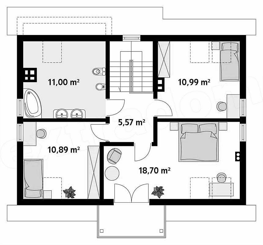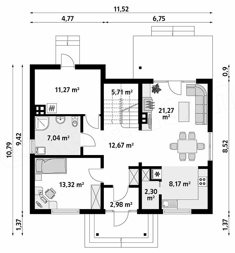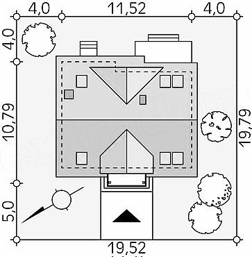 Jednorodzinny dom parterowy z użytkowym poddaszem. Klasyczna bryła budynku na rzucie prostokąta przykryta dwuspadowym dachem. Dom posiada optymalny program dla 4-osobowej rodziny. Na parterze przewidziano w części dziennej otwartą przestrzeń salonu i jadalni, kuchnię ze spiżarnią i dodatkowy pokój, w części gospodarczej łazienkę z kotłownią. Na poddaszu zaprojektowano 3 sypialnie oraz łazienkę.