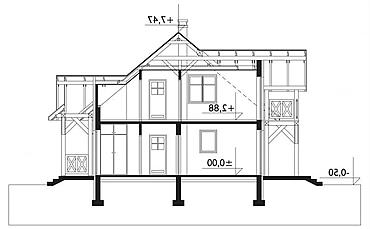 Prosta bryła na bazie kwadratu, nakryta dachem dwuspadowym o kącie nachylenia połaci 40°. Charakterystyczne elementy to podcienia, drewniane elementy wejścia i tarasu oraz okapy przyczółkowe z lukarną i zadaszeniem wejścia.