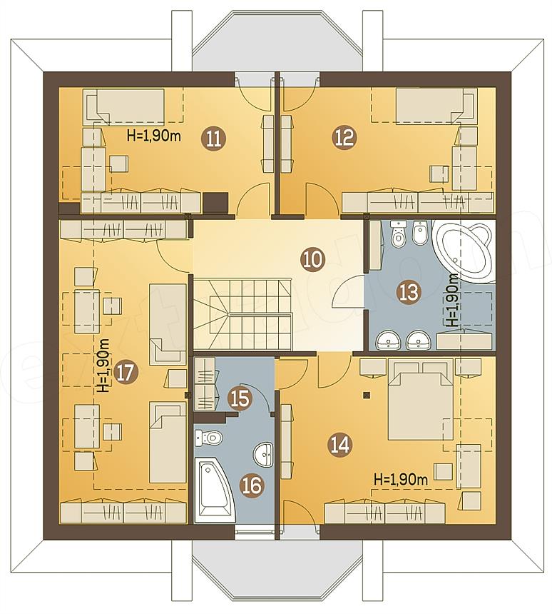 Rodzinny dom piętrowy dla 5-6-cio osobowej rodziny. Przewidziany układ funkcjonalny rozdziela przestrzeń ogólnodostępną, zlokalizowaną na parterze od części sypialnej, znajdującej się na piętrze. Parter obejmuje salon z kuchnią i jadalnią, pokój gościnny, łazienkę oraz spiżarnię przejściową z garażu, hol ze schodami i wiatrołap. W parterze przewidziano również wbudowany jednostanowiskowy garaż i pomieszczenie techniczne z piecem CO - przejściowe do wiatrołapu. Piętro dostępne przez wygodne schody to przestrzeń obejmująca hol, cztery wygodne pokoje sypialne oraz dwie łazienki ( jedna połączona z sypialnią rodziców).