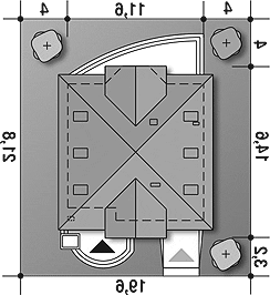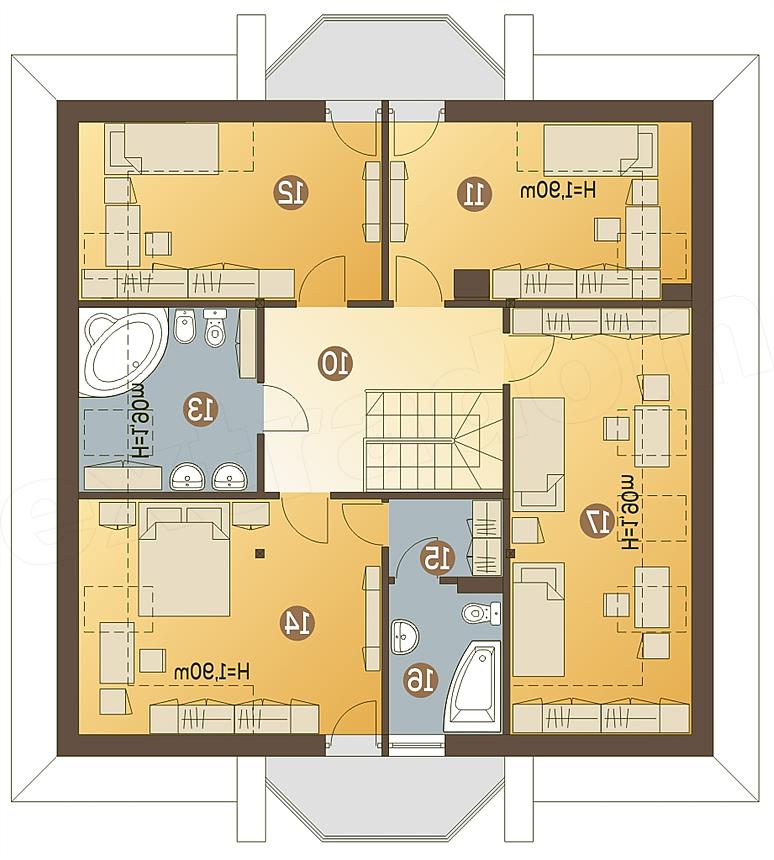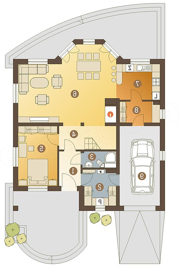 Rodzinny dom piętrowy dla 5-6-cio osobowej rodziny. Przewidziany układ funkcjonalny rozdziela przestrzeń ogólnodostępną, zlokalizowaną na parterze od części sypialnej, znajdującej się na piętrze. Parter obejmuje salon z kuchnią i jadalnią, pokój gościnny, łazienkę oraz spiżarnię przejściową z garażu, hol ze schodami i wiatrołap. W parterze przewidziano również wbudowany jednostanowiskowy garaż i pomieszczenie techniczne z piecem CO - przejściowe do wiatrołapu. Piętro dostępne przez wygodne schody to przestrzeń obejmująca hol, cztery wygodne pokoje sypialne oraz dwie łazienki ( jedna połączona z sypialnią rodziców).