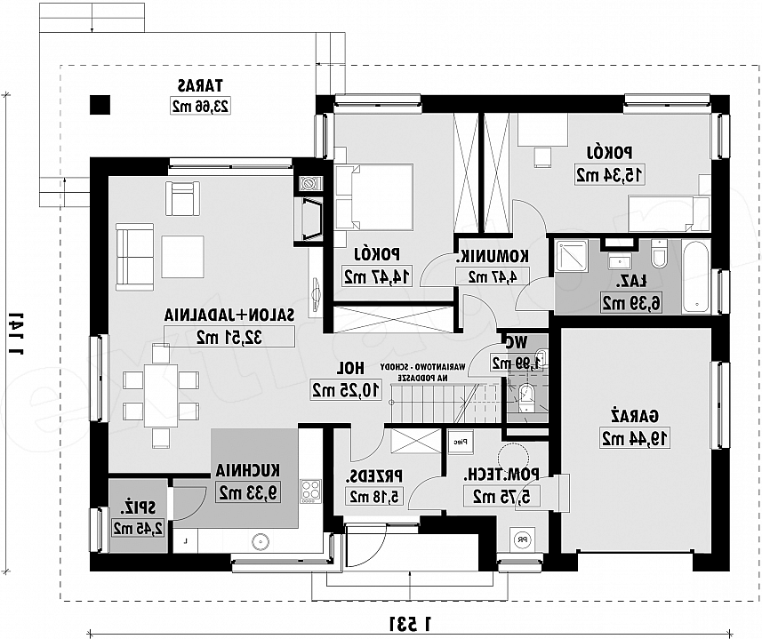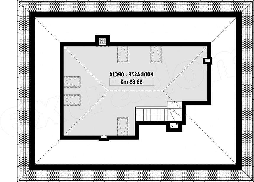 Projekt niewielkiego, nowoczesnego domu z czterospadowym dachem. Dom E-111 to prosta bryła, oparta na rzucie prostokąta i uniwersalny układ funkcjonalny. Czytelny układ funkcjonalny umożliwią podział domu na część dzienną i nocną. Atutem domu jest garaż umieszczony w bryle, oraz bardzo łatwa możliwość zaadaptowania poddasza. W części dziennej zaplanowano salon z jadalnią oraz półotwartą kuchnię ze spiżarnią. W części sypialnej zaplanowano dwie sypialnie, WC oraz łazienkę z wanną i prysznicem. Na poddaszu pokazujemy wariantową powierzchnię możliwą do zaadaptowania. Dla zobrazowania jej wielkości, na rysunku podano powierzchnię netto poddasza, tj. po obrysie ścian. W zakładce "Pliki do pobrania" prezentujemy naszą propozycję podziału poddasza, które można zaadaptować, w ramach adaptacji projektu.