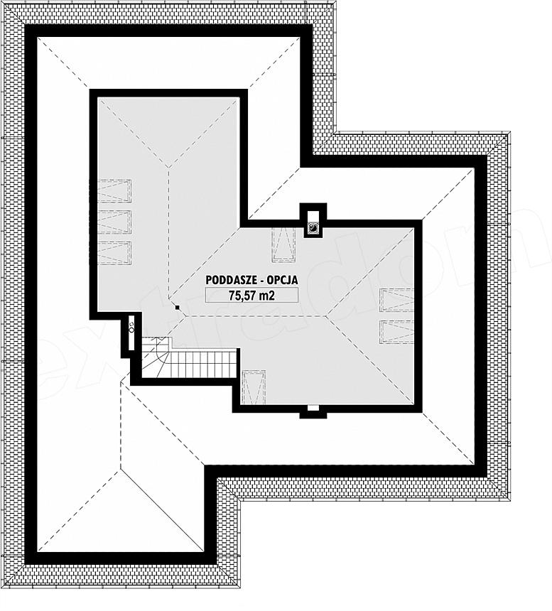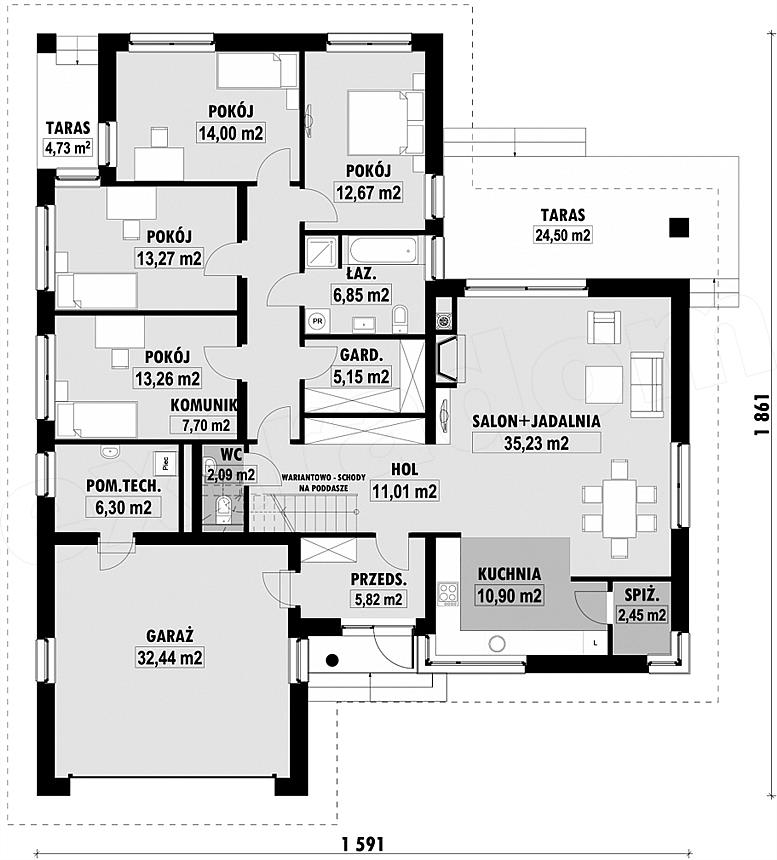Projekt komfortowego domu E-118 należy do rodziny projektów E-114 do E-119. Prosta bryła połączona z uniwersalnym układem funkcjonalnym i dwustanowiskowym garażem. W części dziennej zaplanowano duży salon z jadalnią (szerszy o 60cm w stosunku do E-115/116) i półotwartą kuchnię ze spiżarnią. W części sypialnej: cztery sypialnie, WC oraz duża łazienka z wanną i prysznicem. Wysokość pomieszczeń parteru wynosi 2,95 m. Atutem domu jest też duża garderoba. Na poddaszu pokazujemy powierzchnię możliwą do zaadaptowania. Dla zobrazowania jej wielkości, na rysunku podano powierzchnię netto poddasza, tj. po obrysie ścian.