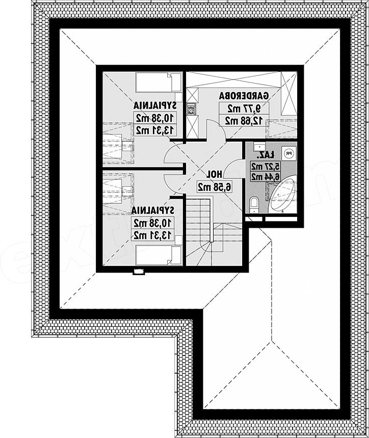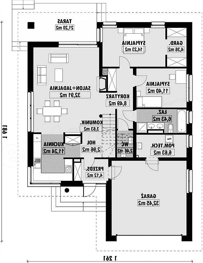 Projekt nowoczesnego domu z dwustanowiskowym garażem, na wąską działkę. Na parterze, w części dziennej zaplanowano duży salon z jadalnią oraz kuchnię. Na parterze znajduje się też sypialnia z garderobą oraz dodatkowy pokój, który można wykorzystać do pracy lub jako sypialnię. W części sypialnianej, na poddaszu zaplanowano dwie sypialnie, dużą garderobę oraz łazienkę z wanną.