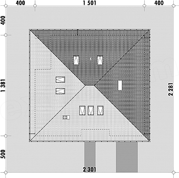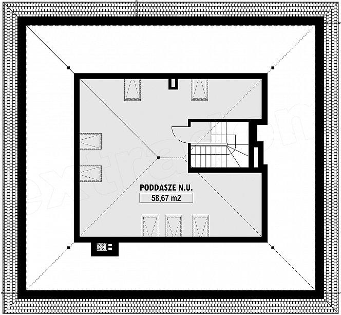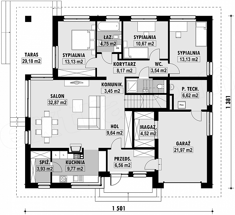 Dom parterowy z tarasem umieszczonym od strony bocznej. Parter składa się z części dziennej i zacisznej strefy prywatnej z trzema sypialniami. Pokój dzienny jest dostępny bezpośrednio po wejściu do domu. Przylega do niego duża kuchnia, z dostępem do praktycznej spiżarni. W pozostałej części domu znajdują się trzy sypialnie. Z największej z nich, przeznaczonej dla rodziców, można wyjść na główny taras. Główna sypialnia oddzielona jest od dwóch pozostałych pomieszczeniem łazienki, co podkreśla jej prywatność. Z korytarza jest również dostęp do łazienki z prysznicem znajdującej się pod schodami. W bryle budynku znajduje się jednostanowiskowy garaż, z którego przejść można do pomieszczenia technicznego i magazynu, który pełnić może również rolę podręcznego warsztatu. Projekt jest węższą wersją projektu E-175.