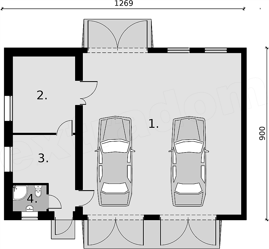 Obszerny garaż dwustanowiskowy, wolnostojący, z pomieszczeniami gospodarczymi i łazienką. Dodatkową zaletą jest przelotowość centralnie usytuowanych drzwi garażowych.