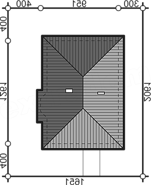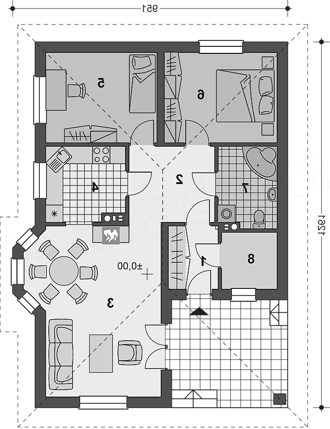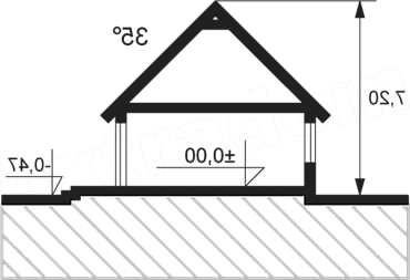 Budynek mieszkalny jednorodzinny wolnostojący, parterowy, niepodpiwniczony; funkcja: pokój dzienny z jadalnią, kuchnia, dwie sypialnie, łazienka, pomieszczenie gospodarcze - kotłownia. Mały, parterowy dom dla tych, którzy chcą szybko cieszyć się własnym miejscem na ziemi. Budynek idealnie nadaje się na działkę z wjazdem i wejściem od południa, bądź południowego zachodu. Spory pokój dzienny atrakcyjnie doświetlany jest przez umieszczone w wykuszu okna - to znakomite miejsce na ustawienie rodzinnego stołu .Prosta bryła przykryta jest czterospadowym dachem, który osłania także przestrzeń będącą jednocześnie tarasem i przedpolem głównego wejścia. Budowa tego domu będzie łatwa i stosunkowo tania.