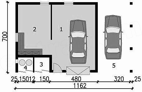 Projekt garażu jednostanowiskowego z pom. gospodarczym i wiatą garażową.