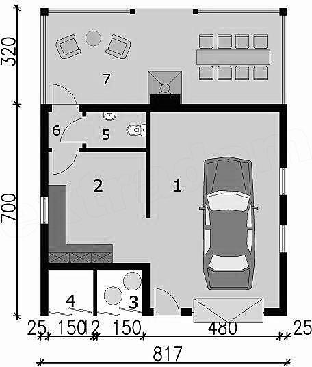 Garaż jednostanowiskowy z pomieszczeniem gospodarczym i werandą. budynek posiada również skład na drewno i odpady oraz WC.Brama garażowa o wymiarach 2,4x2,4m.