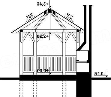 Projekt altany ogrodowej z grillem. Do projektu dołączone jest zestawienie: podstawowych materiałów konstrukcyjnych i więźby dachowej, jak również bezpłatna zgoda na dokonanie zmian.