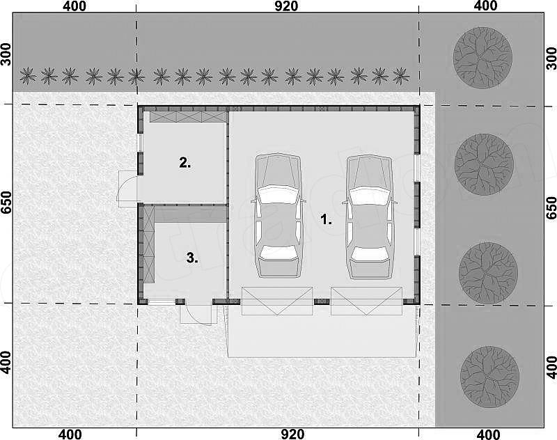 Garaż dwystanowiskowy w technologii szkieletowej, wolnostojący, parterowy. Brama garażowa o wymiarach 2400x2200. Garaż posiada dodatkowe 2 pomieszczenia gospodarcze.Zobacz garaż w wersjii murowanej. Projekt garażu składa się z czterech egzemplarzy a w tym części architektonicznej, konstrukcyjnej i instalacji wewnętrznej elektrycznej. W projekcie załączone są podstawowe zestawienie stali, drewna i stolarki okienno-drzwiowej. Do projektu dołączamy bezpłatną zgodę na wprowadzenie zmian, oświadczenie projektantów o wykonaniu projektu zgodnie z obowiązującymi normami i przepisami oraz kserokopie uprawnień projektantów wraz z aktualnym wpisem do izby.