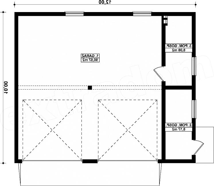 Projekt garażu dwustanowiskowego, parterowego, niepodpiwniczonego, przeznaczonego dla samochodów dostawczych z dwoma pomieszczeniami gospodarczymi. Do projektu dołączone jest zestawienie: stali, więźby dachowej oraz stolarki drzwiowej i okiennej, jak również bezpłatna zgoda na dokonanie zmian.